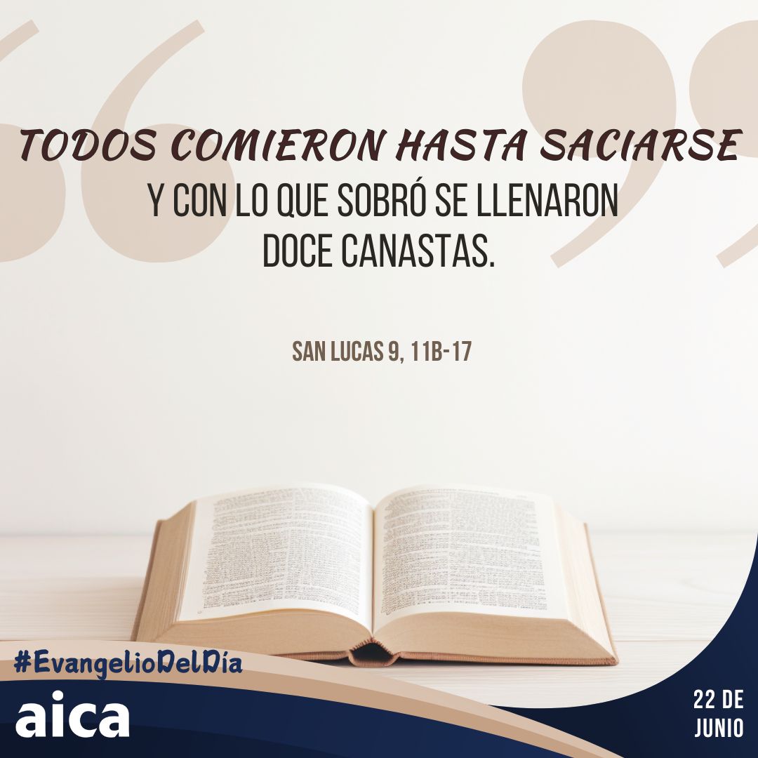 Jesús habló a la multitud acerca del Reino de Dios y devolvió la salud a los que tenían necesidad de ser curados. Al caer la tarde, se acercaron los Doce y le dijeron: "Despide a la multitud, para que vayan a los pueblos y caseríos de los alrededores en busca de albergue y alimento, porque estamos en un lugar desierto". El les respondió: "Denles de comer ustedes mismos". Pero ellos dijeron: "No tenemos más que cinco panes y dos pescados, a no ser que vayamos nosotros a comprar alimentos para toda esta gente". Porque eran alrededor de cinco mil hombres. Entonces Jesús les dijo a sus discípulos: "Háganlos sentar en grupos de cincuenta". Y ellos hicieron sentar a todos. Jesús tomó los cinco panes y los dos pescados y, levantando los ojos al cielo, pronunció sobre ellos la bendición, los partió y los fue entregando a sus discípulos para que se los sirvieran a la multitud. Todos comieron hasta saciarse y con lo que sobró se llenaron doce canastas.